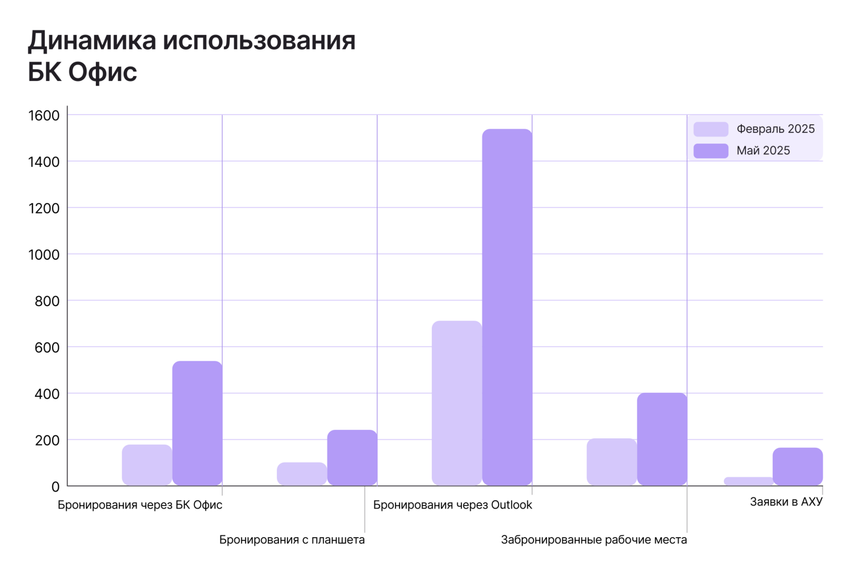 За три месяца количество бронирований и заявок выросло в 2–5 раз — это подтверждает активное принятие системы сотрудниками.